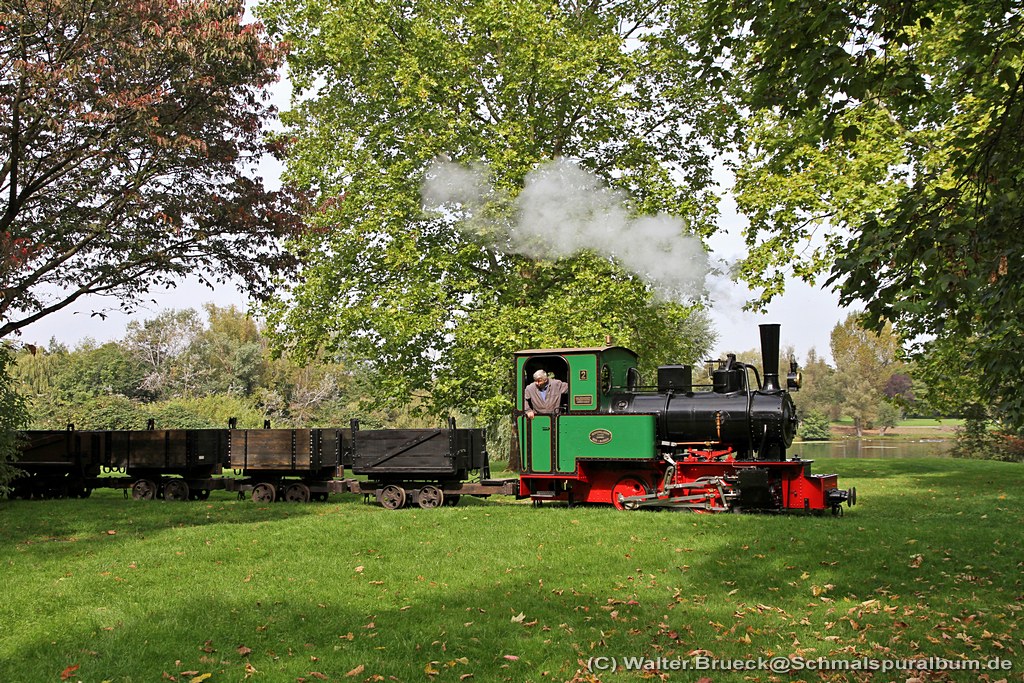 Herbstfahrtag beim Frankfurter Feldbahnmuseum am 28.09.2014. FFM Lok Nummer 2 (Henschel Typ Fabian, Fabrik-Nr. 20517, Baujahr 1925) fährt mit einem Holzloren-Fotozug durch den Rebstockpark. -- Siehe auch weitere FFM Bilder unter www.schmalspuralbum.de/index.php?cat=8 Walter Brück