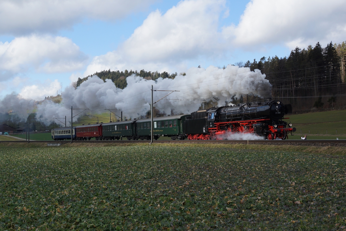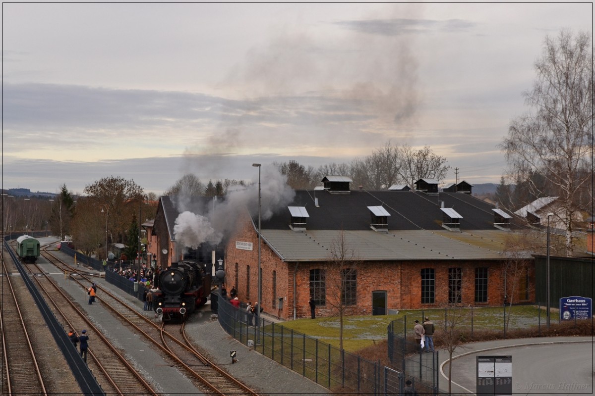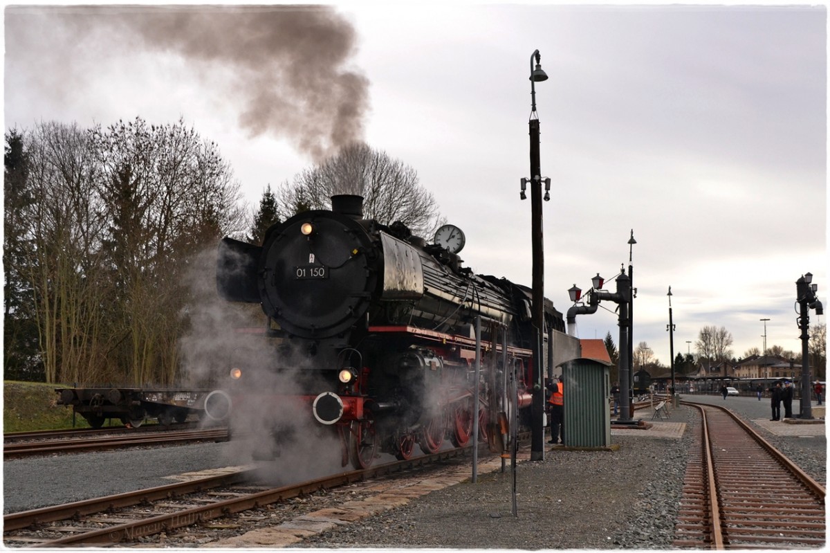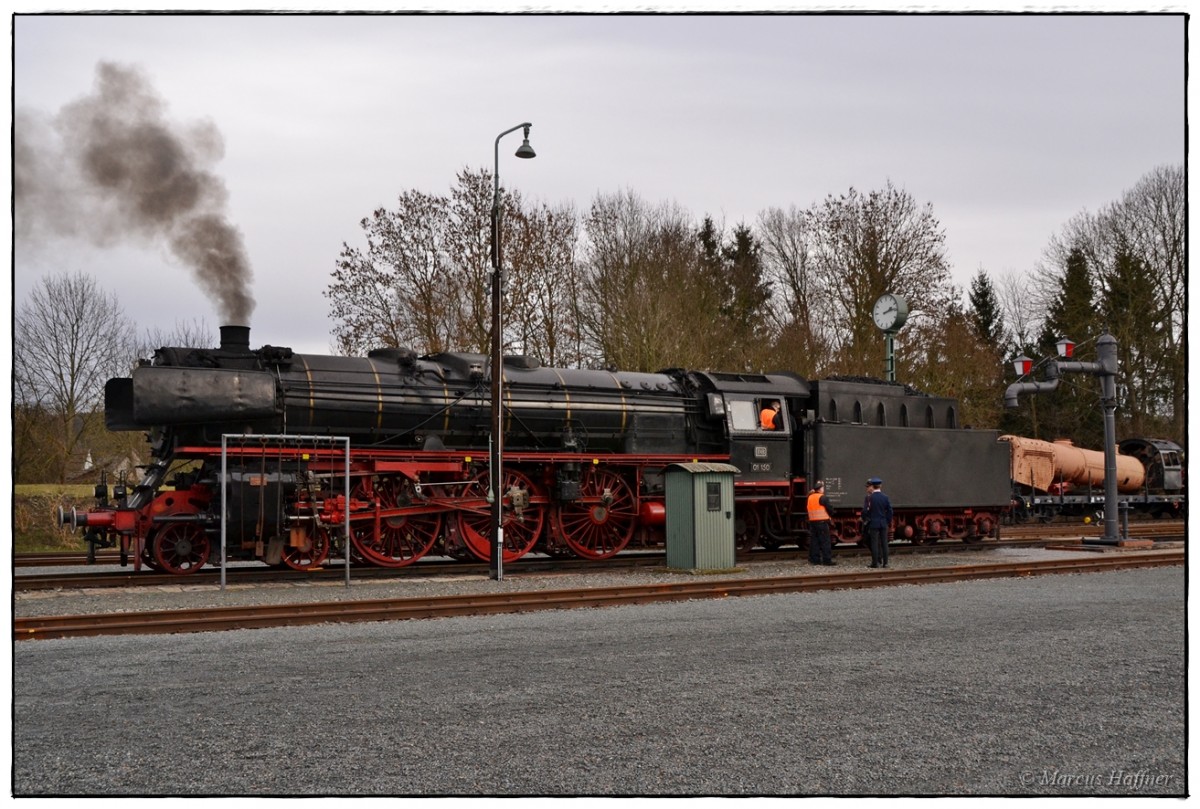 01 150 wurde soeben auf der Drehscheibe im DDM (Deutsches Dampflokomotiv-Museum) gedreht und rangiert jetzt wieder an den Zug um über die Schiefe Ebene nach Marktschorgast zu fahren.