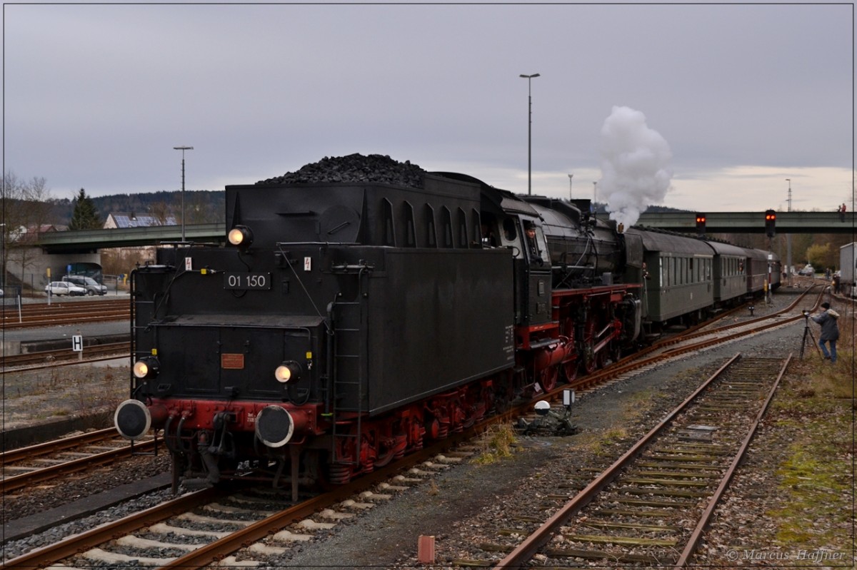 Mit PFIFF! - 01 150 kommt soeben wieder in den Bahnhof Neuenmarkt-Wirsberg von ihrer Fahrt über die Schiefe Ebene zurückgerollt.