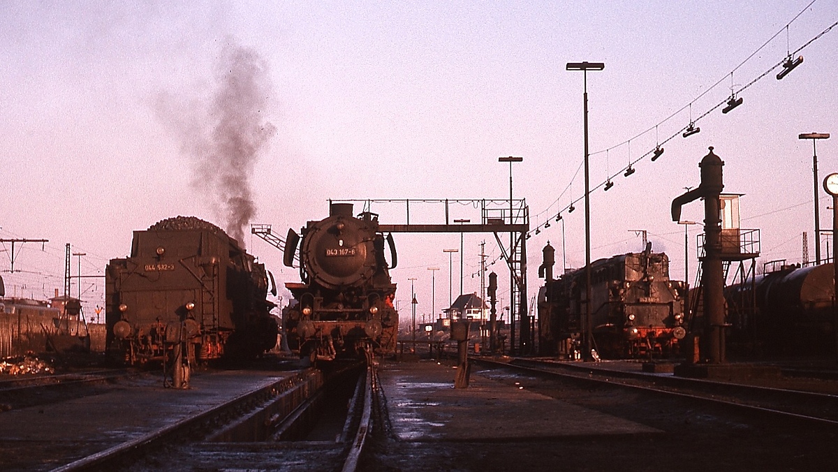 Auch ein schöner Rücken kann entzücken: Alle vier damals noch auf der Emslandbahn eingesetzen Dampflokbaureihen präsentieren sich an einem kalten Februarmorgen 1975 im Bw Rheine auf einem Bild, von links nach rechts 012 055-0, eine unbekannte Emdener 044, 042 083-6 und und 043 672-5 Horst Lüdicke