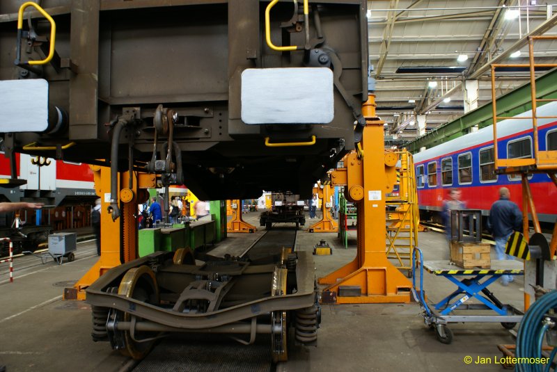 30.08.2007. Ein Großraum-Waggon schwebt über seinen frisch überarbeiteten Drehgestellen. In der Werkshalle der  SFW Schienenfahrzeugwerk Delitzsch GmbH  anlässlich der 100 Jahr Feier.