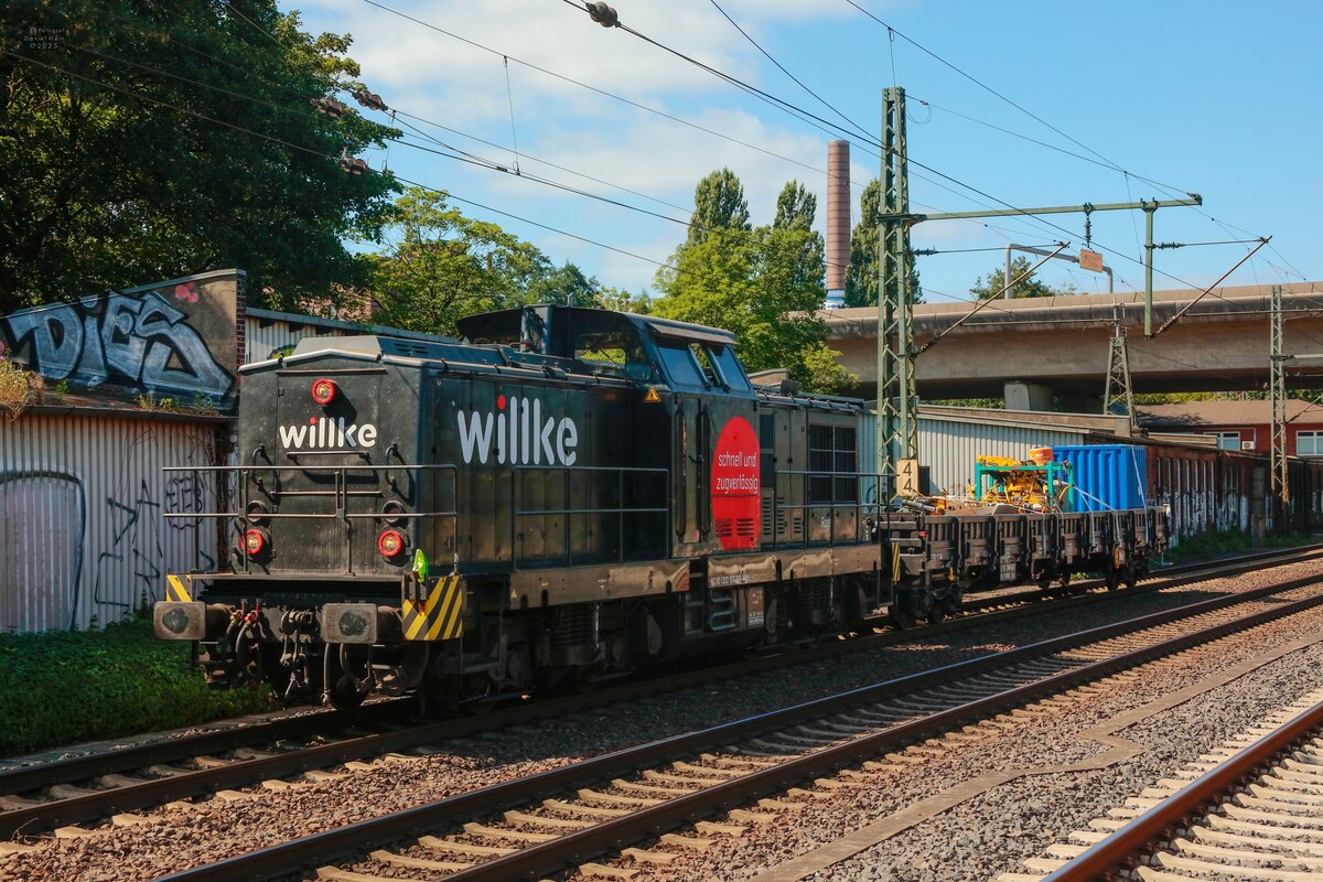 1973 lieferte LEW die Diesellok vom Typ V 100.1 als 110 530 an die DR. Nach dem Einbau eines stärkeren Motors wurde sie in 112 530 umgezeichnet. Bei der DB trug sie dann noch die Nummer 202 530. Die Aufnahme im Bw. Berlin-Lichtenberg vom 20.08.2025 zeigt diese Lok mit ihrer wechselvollen Geschichte als 1203 006 bei Willke Logistics als "Tina" (Datenquelle: v100-online.de). Ernst Lauer