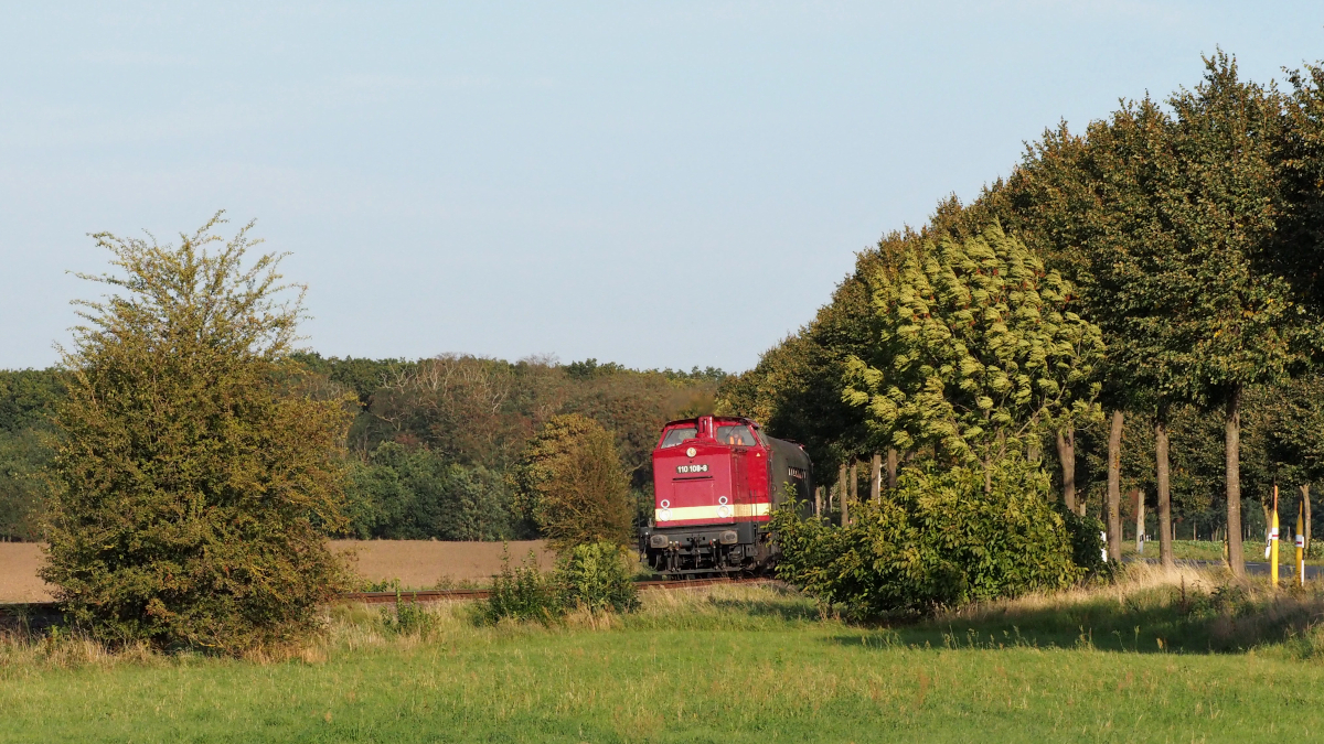 110 108 fährt mit zwei Bghw-Wagen und 202 726 auf der als "Saftbahn" bekannten Strecke von Bitterfeld nach Heideloh, hier kurz vor dem Ziel. Anlass war ein Betriebsausflug der RBB nach einem öffentlichen Event zum Tag der Schiene.