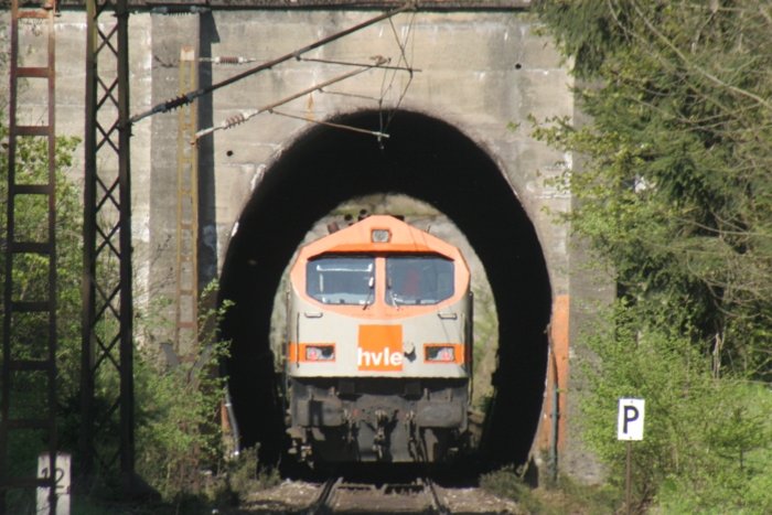 40 Minuten später schiebt V330.2 die Gegenleistung, einen Kalkkesselzug, durch den Nebelholztunnel. Als Zuglok dient 285 001; 08.05.2008 André Breutel