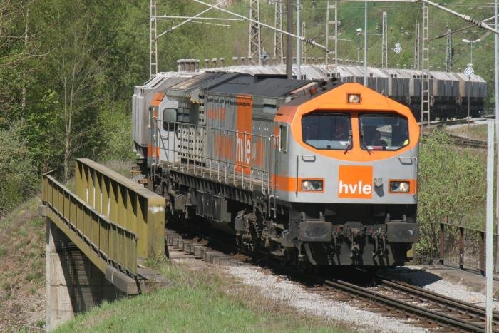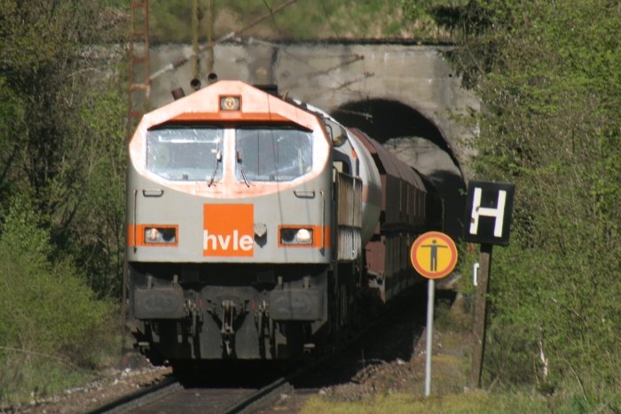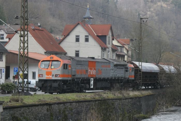Die V330.1 ist ein seltener Gast in den Harzer Bergen. Heute tat sie hier oben ihren Dienst, da die 285 001 beim Bahnfest vom Brücke e.V. ausgestellt ist und eine Sonderzugleistung übernimmt. Der erste Serien-Tiger kam 2005 auf die Rübelandbahn und tat im blau getigerten Outfit seinen Dienst. Im Juni 2006 bekam die 250 002 ihren Hvle-Anstrich. Hier verlässt V330.1 mit einem Kalkzug den Werkbahnhof vom Fels-Werk 1 im Mühlental; 10.05.2008 André Breutel