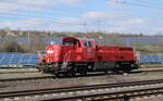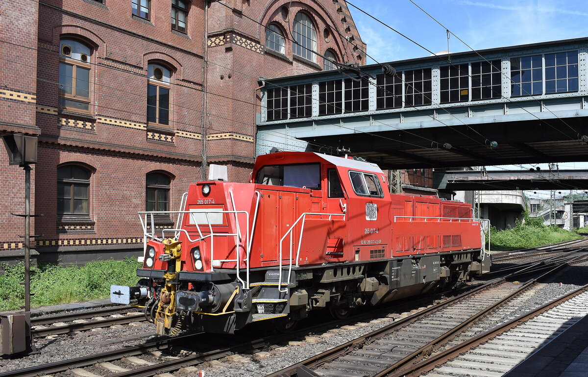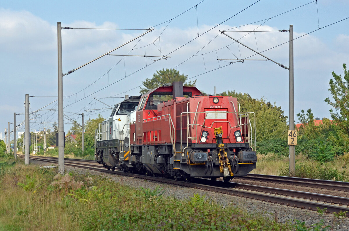 185 357-1 schleppt 265 002-6 (Voith Gravita 15L BB) aus der Zugbildungsanlage (ZBA) Halle (Saale) in südliche Richtung.