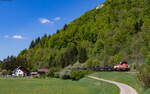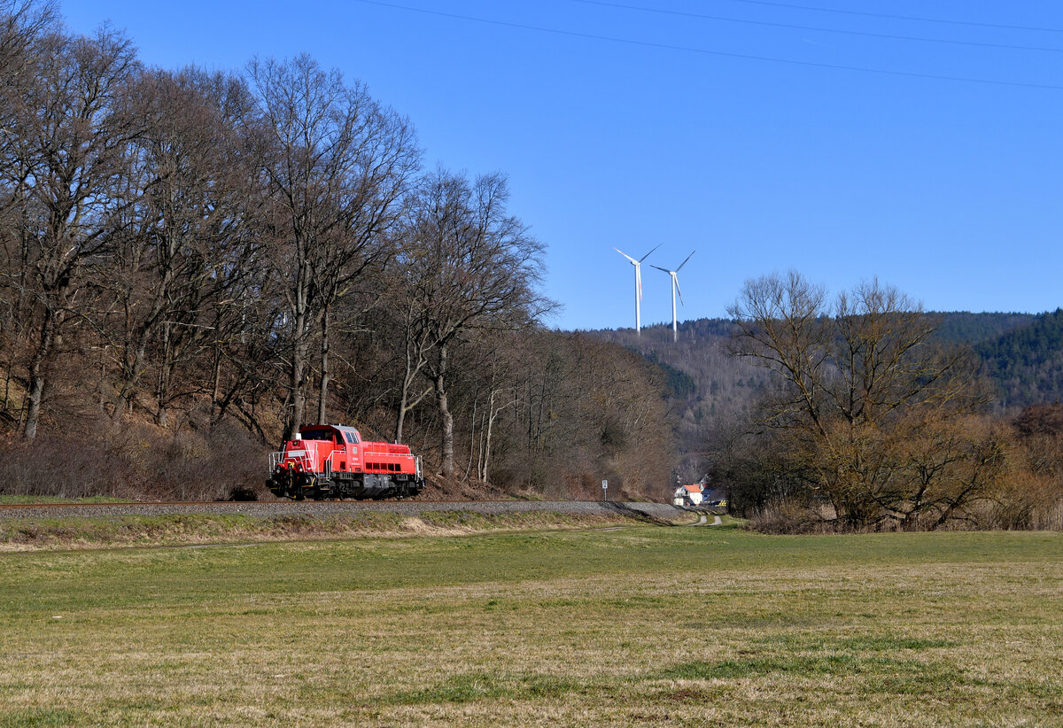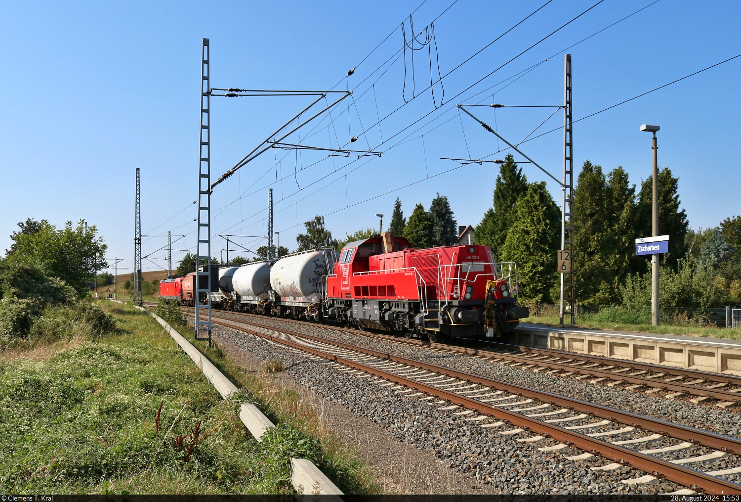 Am Ende einer kurzen Übergabe hängt 265 020-8 (Voith Gravita 15L BB), wie dieser Nachschuss zeigt. Sie wird, zusammen mit vier Wagen, von 6193 389-4 (Siemens Vectron) durch den Haltepunkt Zscherben Richtung Teutschenthal gezogen.