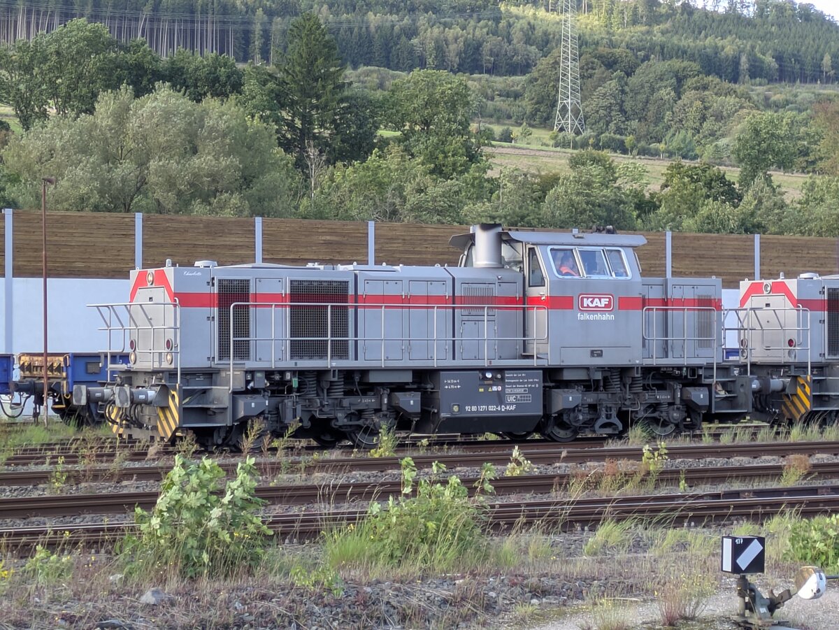 Die 271 022-6 „Charlotte“ (92 80 1271 022-6 D-KAF) eine Vossloh/MaK G 1000 BB der KAF Falkenhahn Bau AG. ex MRCE bzw. ex HGK DH 49, am 26 August 2025 mit einem mit Aushub beladenen Niederbordwagen-Zug (zweiachsiger Flachwagen NS Gattung Klmos 702 der Vermietungsfirma Railpro), bei der Baustelle im Bf Scheuerfeld/Sieg.