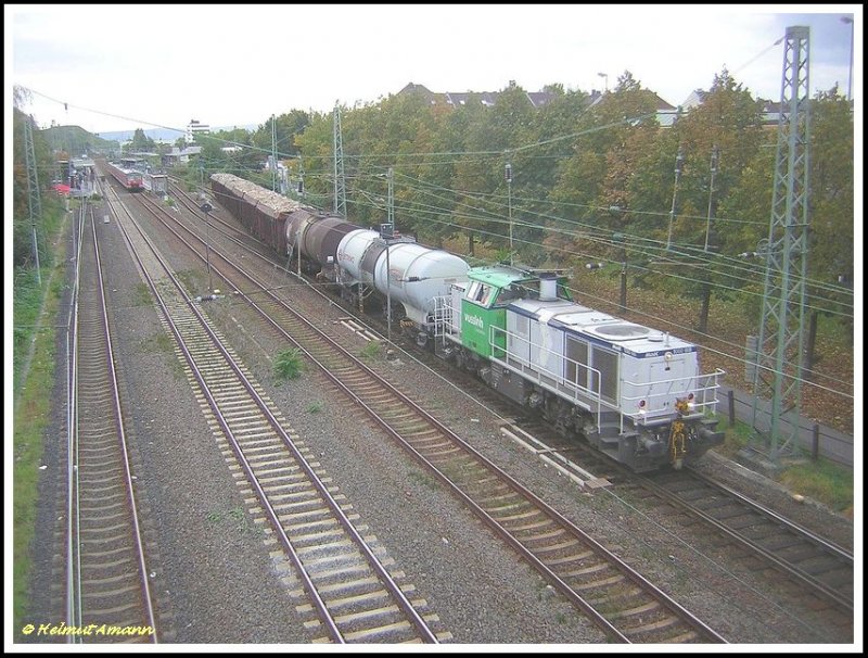 Vorne als Zuglok die KSW 44 (92 80 1271 004-4 D-KSW) eine MaK G 1000 BB und hinten nachschiebend die an die KSW vermietete 272 408-6 / D20 der Bentheimer Eisenbahn AG (92 80 1272 408-6 D-BE), ex Rurtalbahn V 203 (92 80 1272 408-6 D-RTBC), eine Vossloh G 2000BB (mit symmetrischem Führerhaus). Armin Schwarz