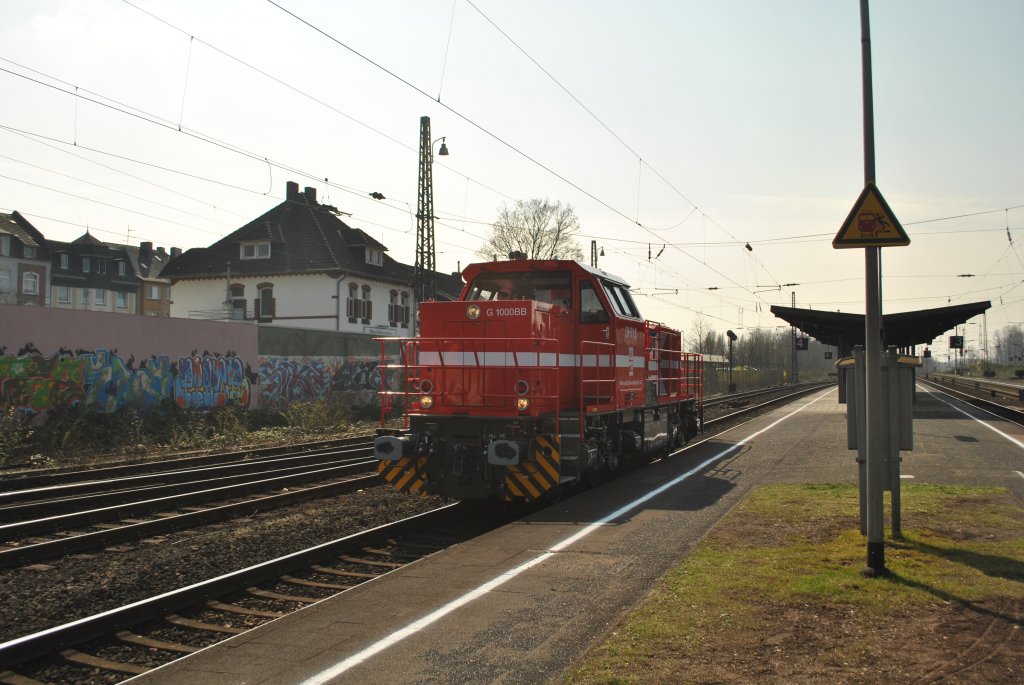 Lok 44 (MaK G 1000 BB) der Kreisbahn Siegen-Wittgenstein (KSW) fährt, auf KSW eigenem Gleis, mit vollem Güterzug am 25.03.2011 in Neunkirchen über den Bahnübergang Wiesenstraße in Richtung Salchendorf. Armin Schwarz