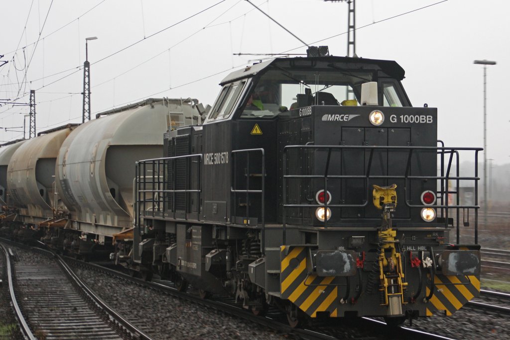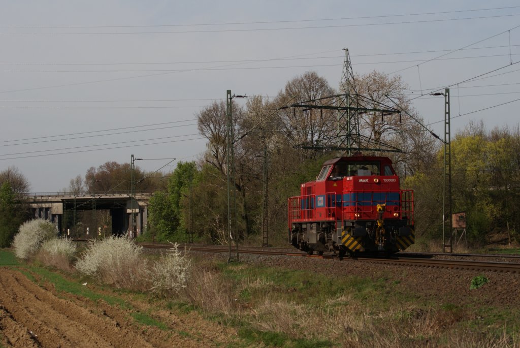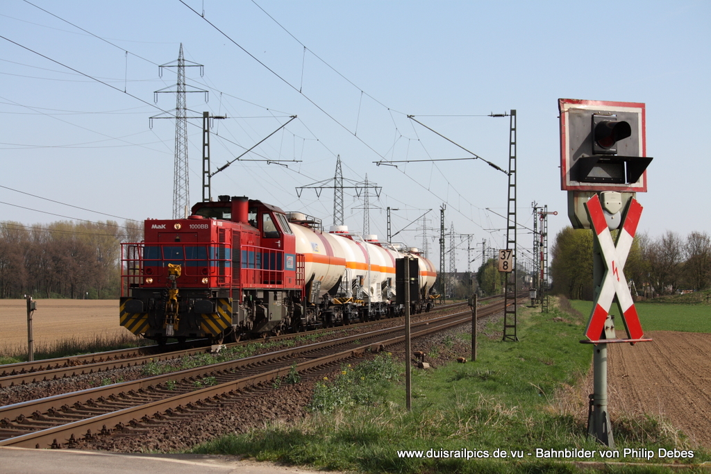 Eine MaK G1000 BB der HGK kommt gerade aus dem Bereich des Ludwigshafener Rheinhafens in dem sich die Raffinerie und das Container-Terminal befinden. Sie brachte zuvor Kesselwagen in die Raffinerie und fährt nun, nachdem sie die Straßenbahnschienen und eine Hauptstraße überquert hat, Richtung Ludwigshafen-Mundenheim um die Hauptstrecke Kaiserslautern-Mannheim zu erreichen. 17.03.2011 Christian Kühn