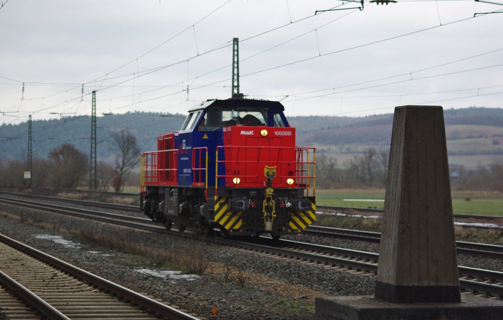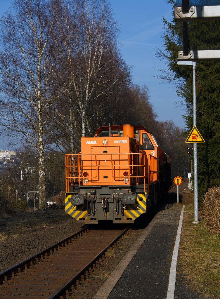 Lok 44 (MaK G 1000 BB) der Kreisbahn Siegen-Wittgenstein (KSW) mit 2 Güterwagen am 04.03.2011 in Neunkirchen-Altenseelbach, Sie kommt von Burbach auf DB Gleis und fährt nach Herdorf, wo die KSW eine Gleisanlage betreibt. Dort werden dann kompl. Züge zusammengestellt. Armin Schwarz