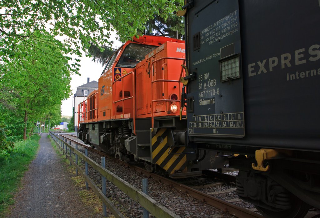 Lok 44 (MaK G 1000 BB) der Kreisbahn Siegen-Wittgenstein (KSW) mit vollem Coilgüterzug fährt am 04.05.2011 auf KSW-Gleis in Neunkirchen-Struthütten, Richtung Neunkirchen-Salchendorf. Armin Schwarz