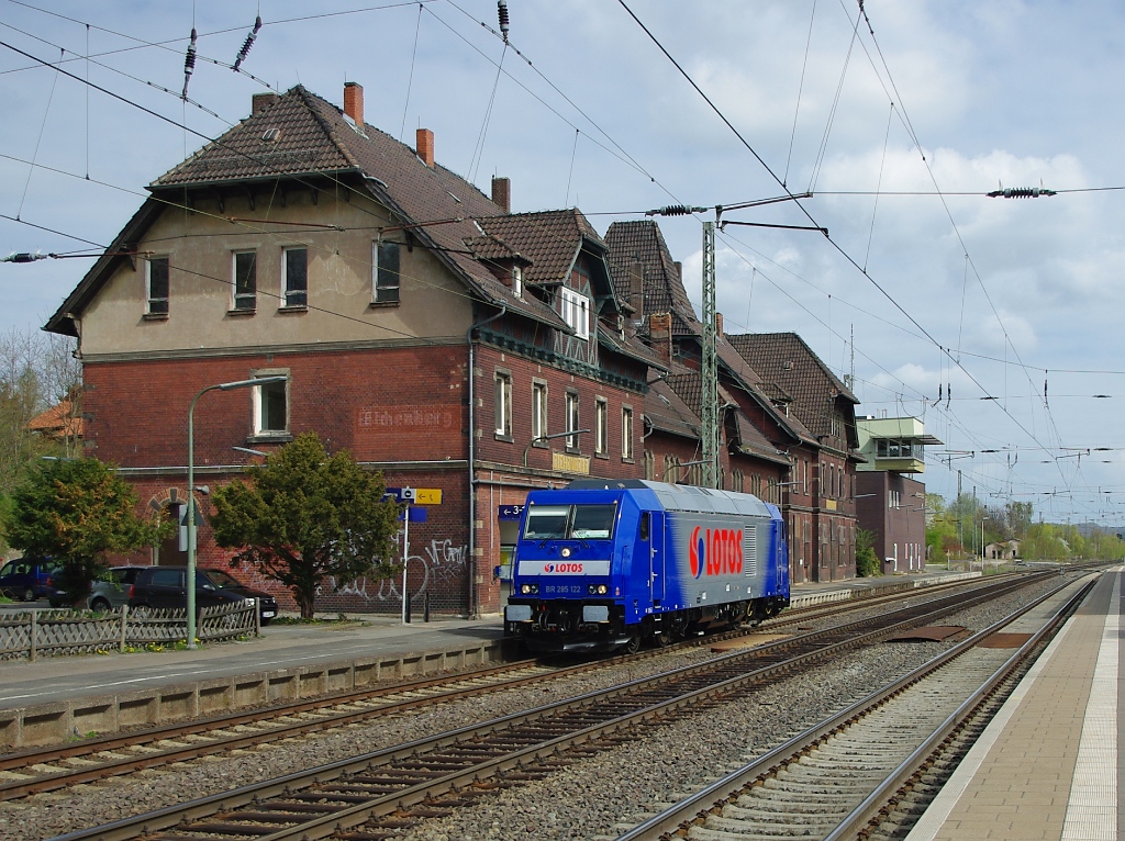 Die Lotos 285 122 kam am 15.04.2011 nach kurzer Zeit von ihrer Probefahrt aus Richtung Norden zurück um wieder nach Kassel zu fahren. Hier vor dem Bahnhofsgebäude in Eichenberg. Jens Baumhauer