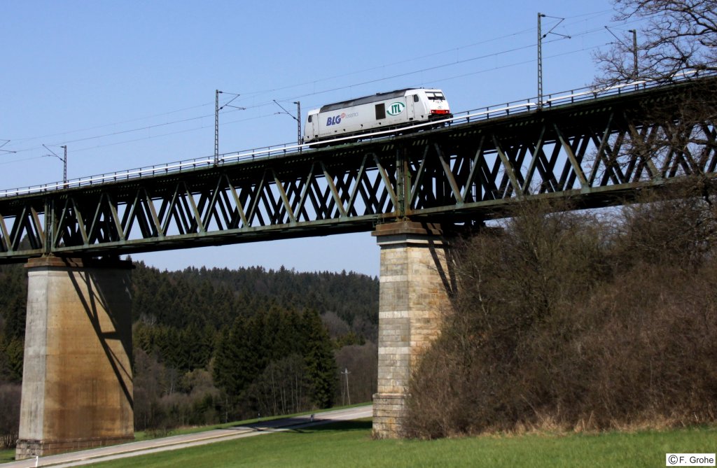 ITL 285 108-7 mit Werbung BLG Logistics auf Leerfahrt Richtung Regensburg, KBS 880 Nürnberg - Passau, fotografiert auf der Laaberbrücke bei Deining am 19.04.2010 Frank Grohe
