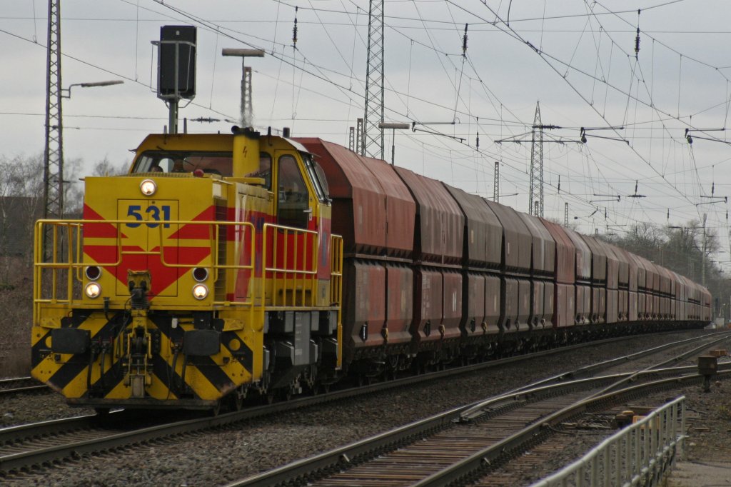 Captrain V 157 [NVR-Nummer: 98 80 0274 108-6 D-CCW] fuhr, mit einem Kohlezug, am HP Duisburg Bissingheim vorbei. Aufgenommen am 07.04.19. Zwangsbremsung