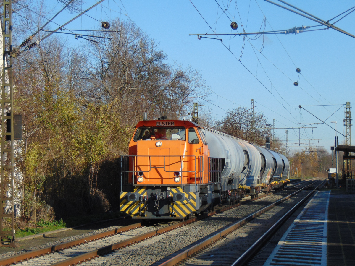 Am 11.11.2007 verkehrte wieder einmal der TWE Stahlzug von Hanekenfähr nach Paderborn. um 11.44 Uhr hatte er Lengerich durchfahren und fuhr hier in die ansteigende Rampe zur DB Überquerung in Lengerich Hohne ein. In diesem Streckenteil musste sich die Zuglok V 157 der TWE mächtig ins Zeug legen, um den schweren Brammenzug über die Rampe zu bekommen. Gerd Hahn