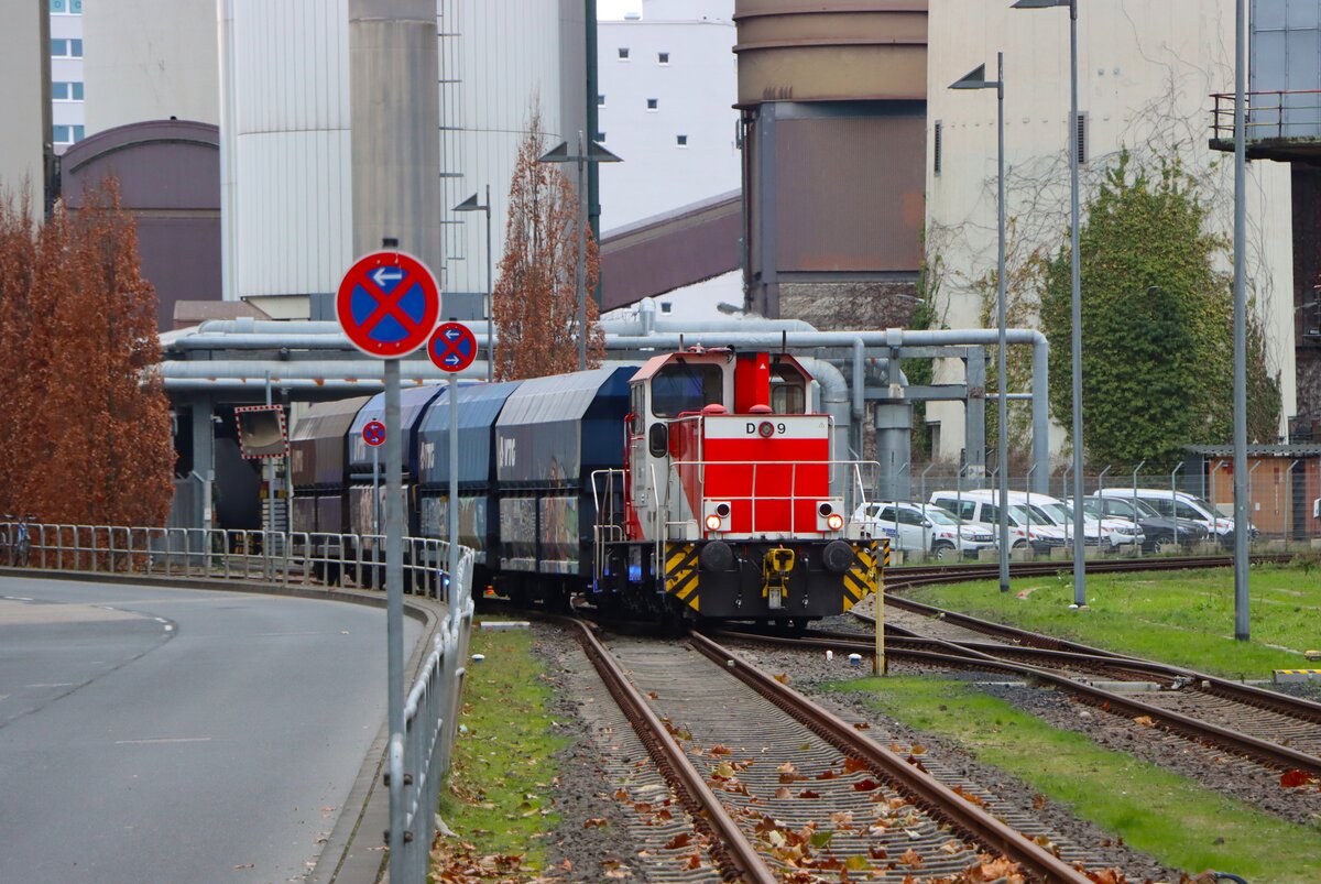 HFM Hafenbahn Frankfurt am Main Krauss Maffei MH05 Rangierlok D9 (98 80 0505 013-9) beim Rangieren am 29.12.25 in Frankfurter Westhafen von einen Gehweg aus fotografiert Daniel Oster