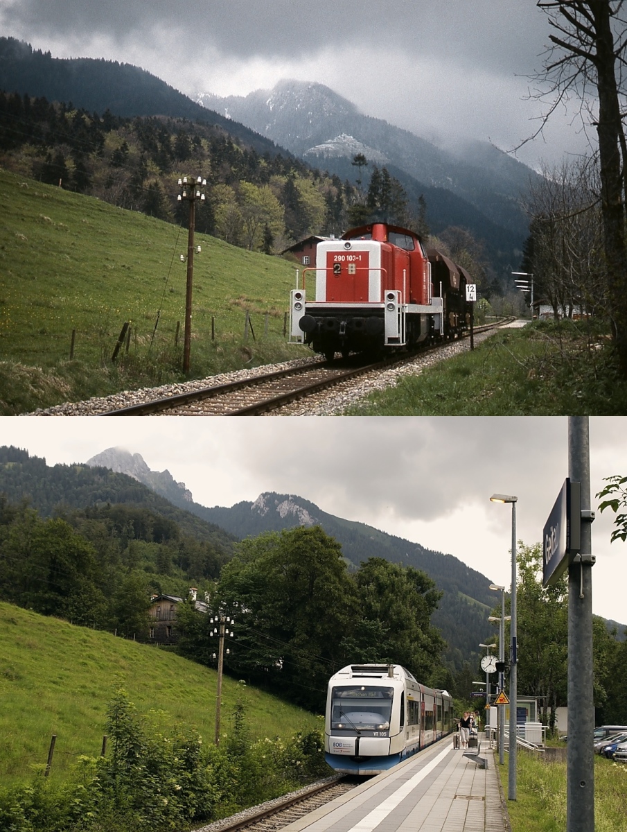 Als 290 103-1 im Frühjahr 1989 den Haltepunkt Geitau durchfährt, erinnert nichts mehr daran, dass auf der rechten Grünfläche einmal ein Ladegleis lag. Das im Hintergrund ganz rechts erkennbare Stationsgebäude wurde damals schon lange privat genutzt. Auf dem unteren Bild, das am 18.07.2020 entstand, trifft der aus Bayrischzell kommende VT 105 am inzwischen verlegten Bahnsteig ein. Horst Lüdicke