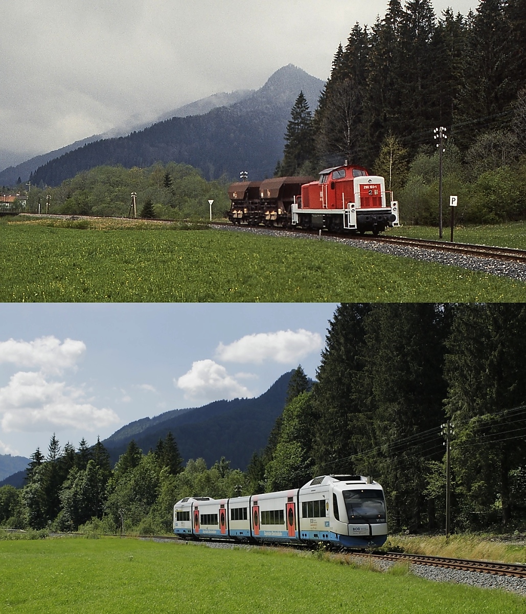 Selbst die Telegrafenmasten stehen noch und auch sonst gab es in den 31 Jahren, die zwischen diesen beiden Aufnahmen liegen (sieht man einmal von der in die Höhe geschossenen Vegetation ab) kaum Veränderungen: Oben bringt 290 103-1 im Frühjahr 1989 bei Fischbachau zwei Schotterwagen nach Bayrischzell, auf dem unteren Bild ist der Integral VT 107 am 18.07.2020 an der gleiche Stelle unterwegs Horst Lüdicke