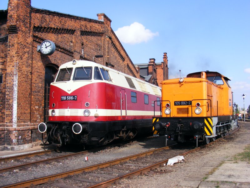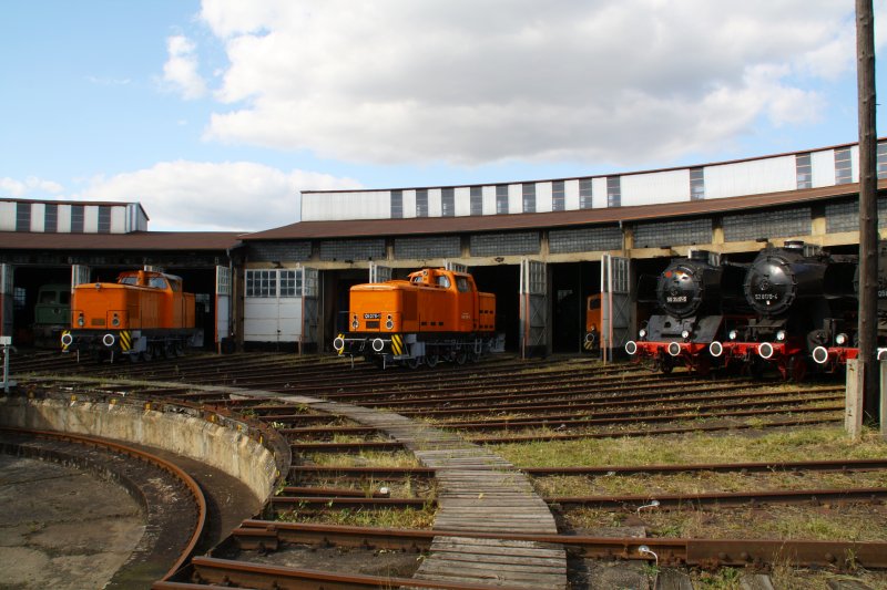Eine nicht beschilderte DR V 60 und die 106 078-9 standen am 12.09.09 vor dem Lokschuppen des ehemaligen BW Falkenberg oberer Bahnhof. Zur Zeit ist die Anlage nur an wenigen Tagen im Jahr zugänglich, hier soll aber in Zukunft ein Eisenbahnmuseum entstehen. Daniel T.