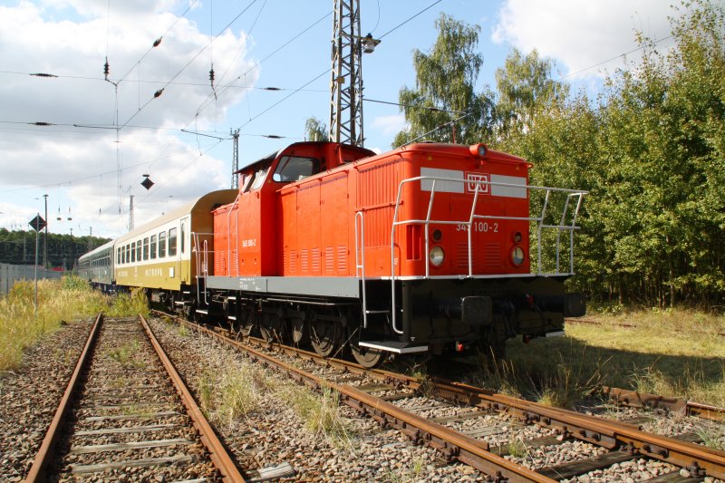 Die Gastlok 345 100-2 zog am 12.09.09 im ehemaligen BW Falkenberg oberer Bahnhof noch 3 Schätze aus der Wagenhalle. Zur Zeit ist die Anlage nur an wenigen Tagen im Jahr zugänglich, hier soll aber in Zukunft ein Eisenbahnmuseum entstehen. Daniel T.
