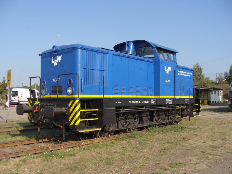 Eisenbahnfest im Handelshafen in Magdeburg. Ausgestellt war unter anderem 346-001 (345 387-5) der Laeger & Wöstenhöfer GmbH & Co. KG (L&W). Fotografiert am 20.09.2009. Christian Geschonneck
