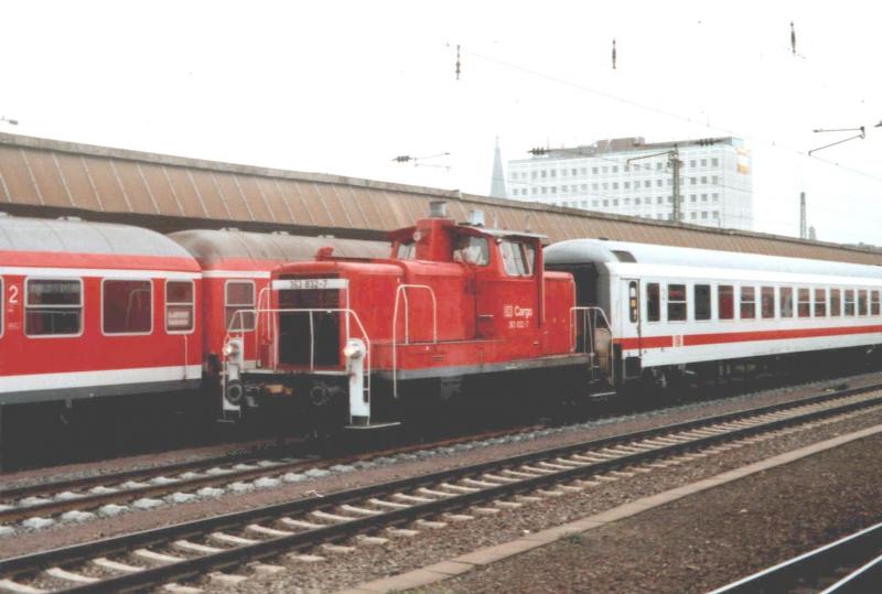 363 832 rangiert am 18.10.03 in Koblenz mit einigen IR- und n-Wagen herum.