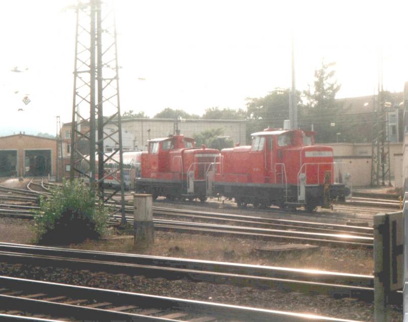 Zwei 363er ruhen sich am 19.8.03 im Abstellbahnhof Aachen,und zwar vor dem Stellwerk Af,aus.