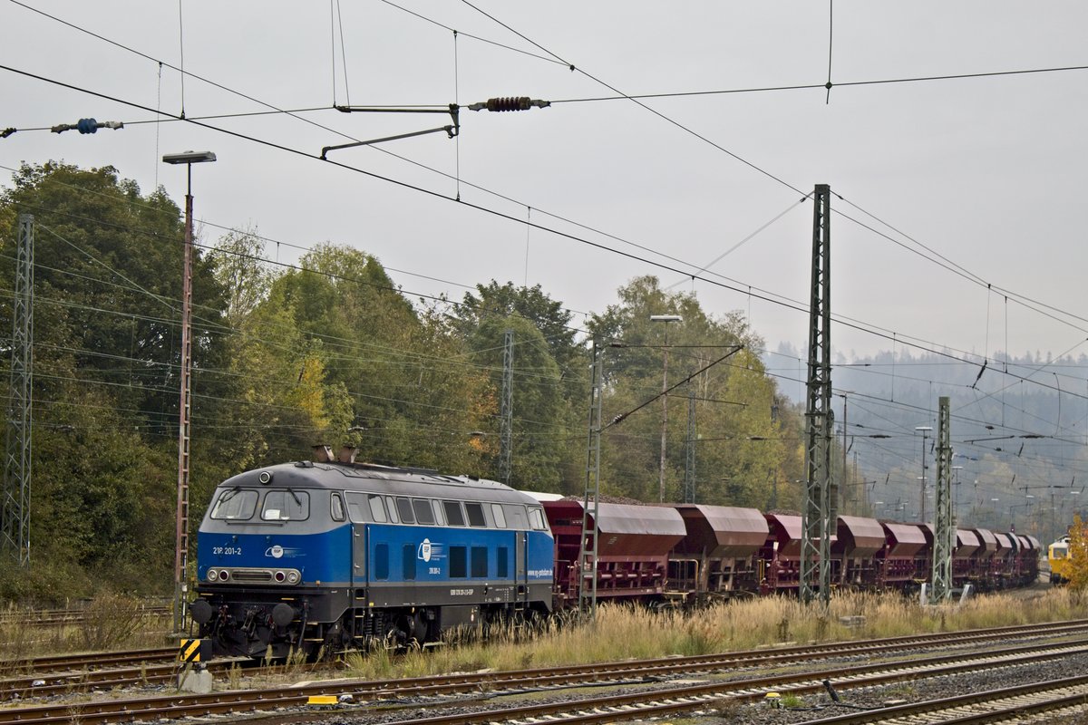 Die 218 485-1 (92 80 1218 485-1 D-AIX) der AIXrail GmbH ist am 20.10.2020 mit einem Flachwagenzug im Bahnhof Herdorf. Der Wagenzug wird später mit Altschotter beladen.