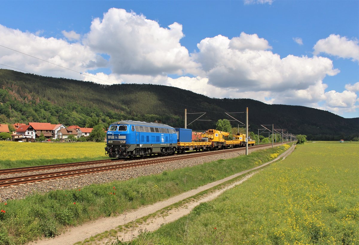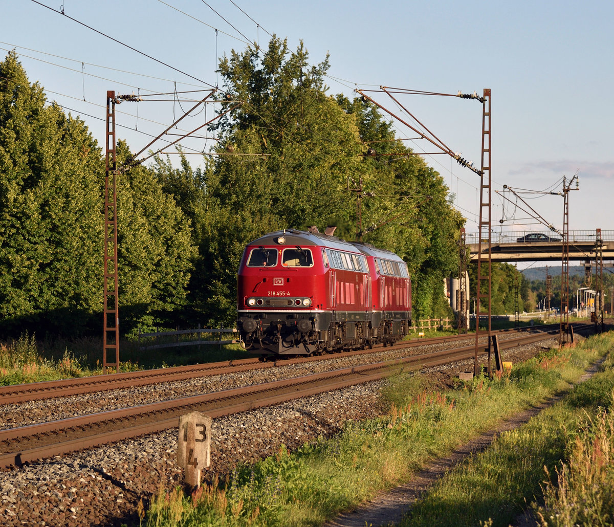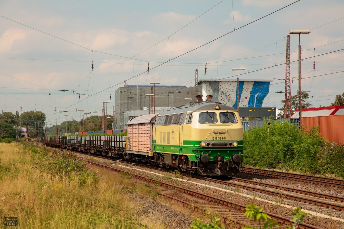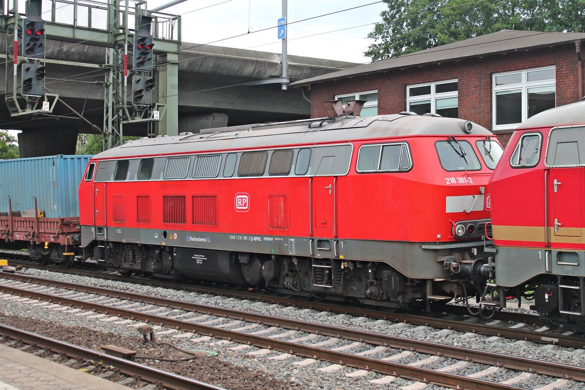 Portrait von RPRS 218 381-2, als diese am Abend des 18.07.2019 zusammen mit der RPRS 218 469-5 "Betty Boom" und einem Bauzug aus dem Gbf Harburg in den Bf Harburg vorgezogen hatte, um diesen auf ein anderes Gleis im Güterbahnhof zu rangieren. Tobias Schmidt