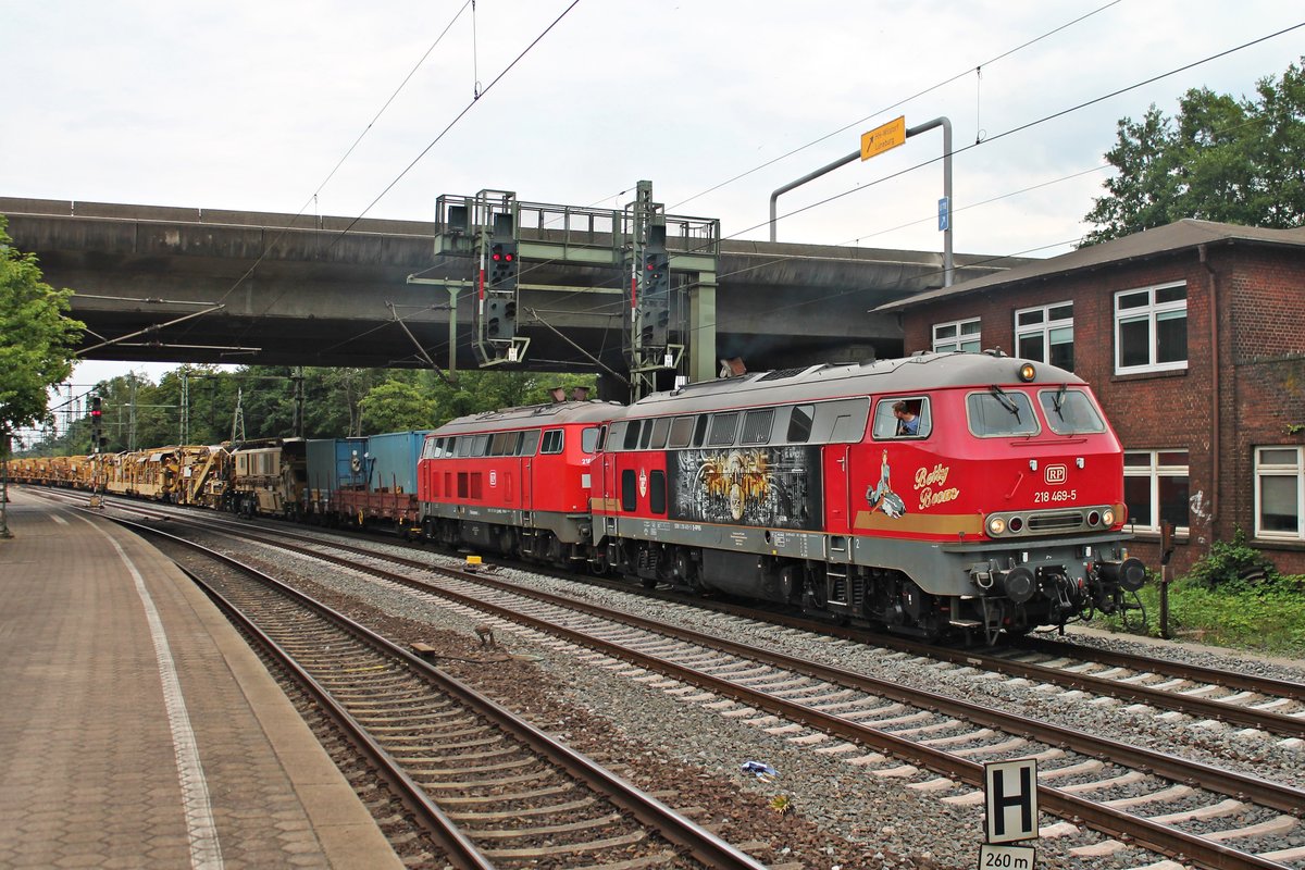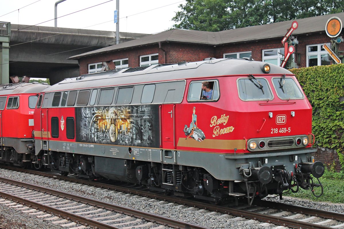 Portrait von RPRS 218 469-5 "Betty Boom", als diese am Abend des 18.07.2019 zusammen mit der RPRS 218 381-2 und einem Bauzug aus dem Gbf Harburg in den Bf Harburg vorgezogen hatte, um diesen auf ein anderes Gleis im Güterbahnhof zu rangieren. Tobias Schmidt