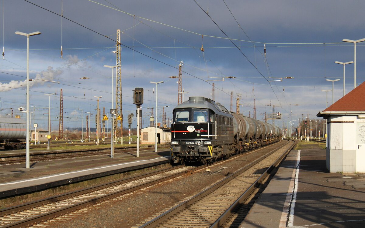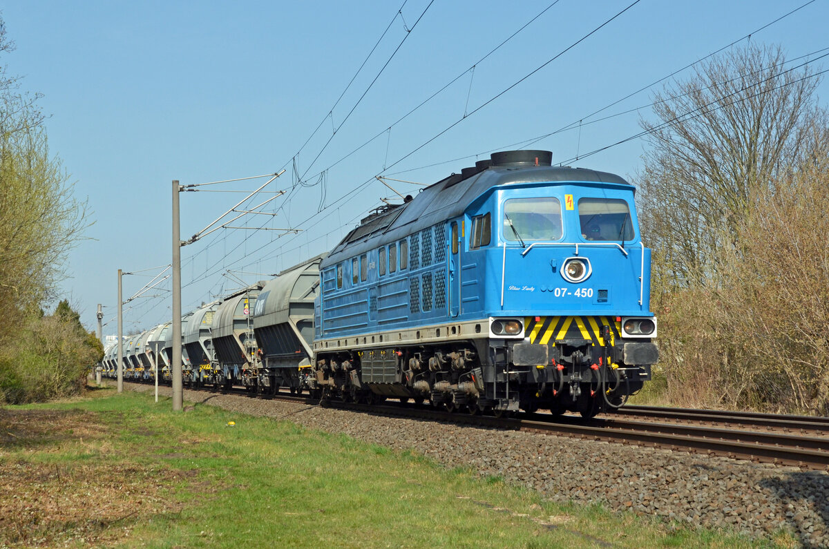 Mit dem leeren Dolomitzug aus Brandenburg am Haken rollte 233 450 vom Bahnbetrieb Gera am 02.04.25 durch Greppin Richtung Bitterfeld. Die aus Bulgarien stammende Ludmilla hat das Outfit ihres Vorbesitzers behalten. Martin Schneider