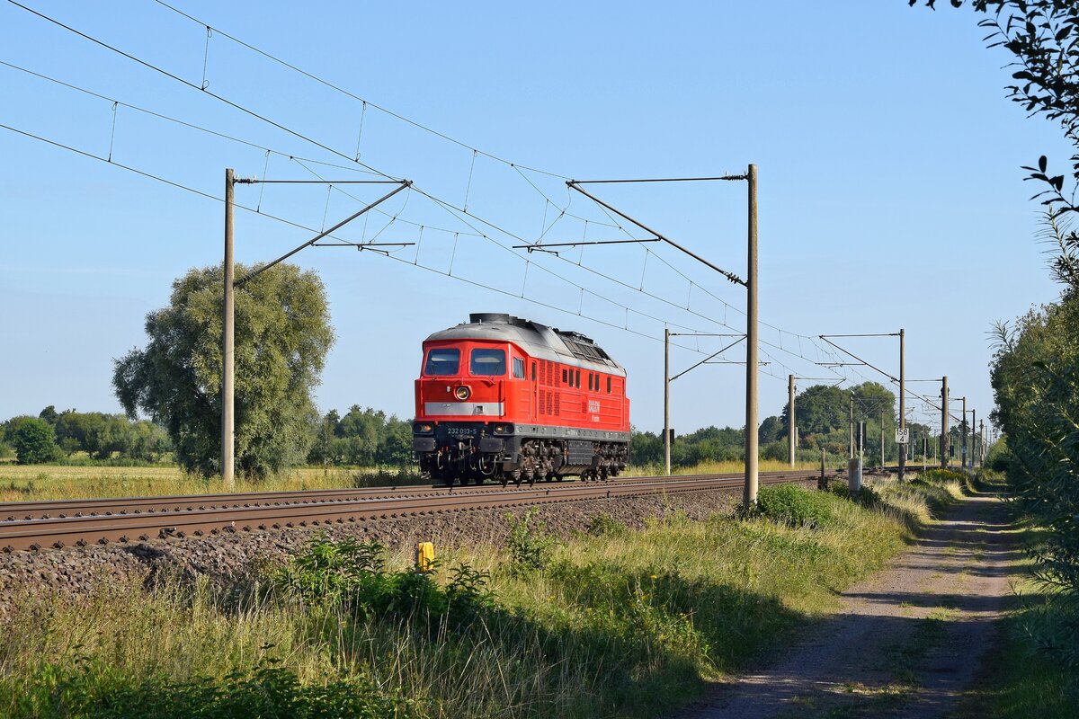 232 241 brachte an ihrem letzten Tag vor Fristablauf einen Militärzug von Rostock Seehafen nach Pasewalk Drögeheide. Hier zu sehen die Rückfahrt des Leerzuges notgedrungen in Bentwisch aufgenommen (06.09.2022).