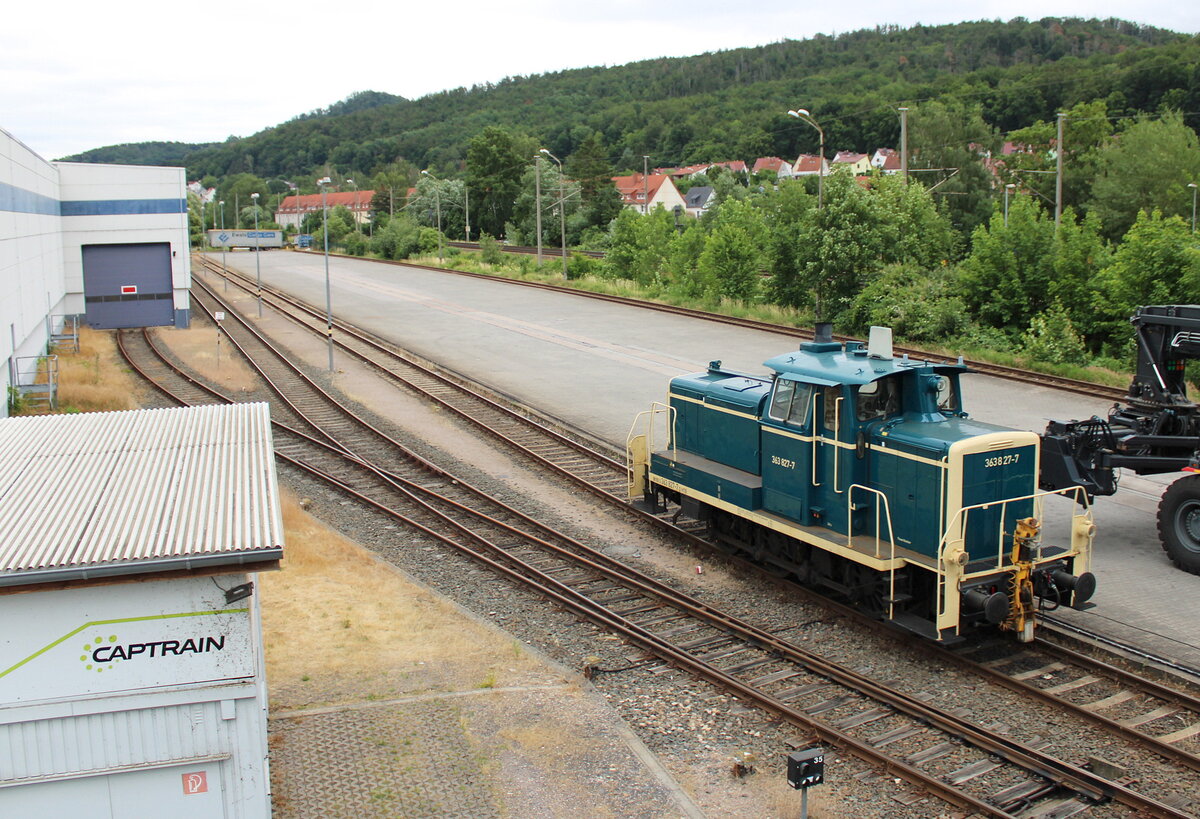 Die 363 827-7 der Hörseltalbahn pausierte am 01.07.2023 im KV-Terminal Eisenach. Von der Brücke zum Hp Eisenach Opelwerk aus fotografiert. Frank Thomas