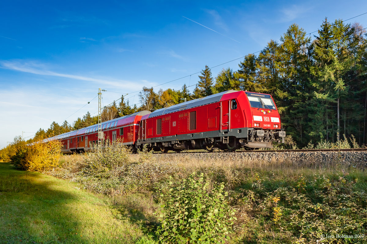 Die Sonne am 4. September 2017 war in Poing gerade damit beschäftigt, unterzugehen - als eine 245 mit ihrem Doppelstockzug von München Hbf nach Mühldorf sie hinter sich ließ. Stephan Möckel