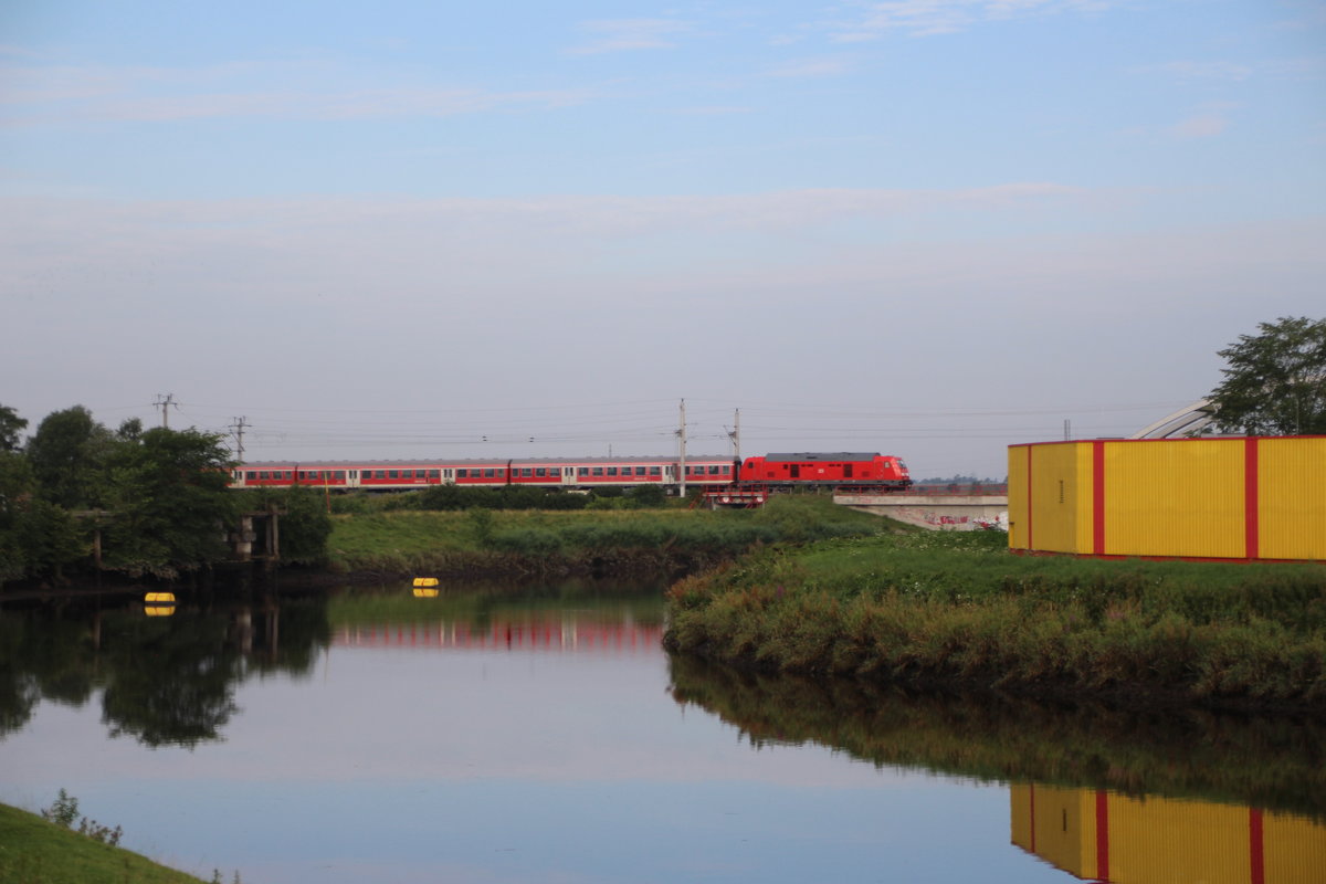 Zwischen Eriskirch und Friedrichshafen hat 245 035, eine von derzeit drei neuen Loks der Baureihe 245 auf der Süd- und Bodenseegürtelbahn, die Wagen des IRE 4234, Lindau - Stuttgart, am Haken (07.08.2017). Jürgen Vos