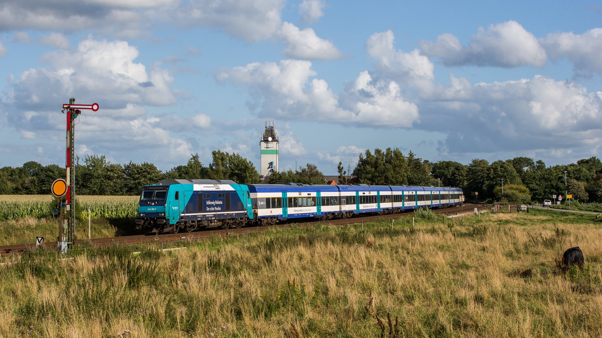 245 021 zieht ein Sylt-Shuttle über den Hindenburgdamm und hat in Kürze Festland erreicht, aufgenommen am Friedrich-Wilhelm-Lübke-Koog am 13. August 2017. Rolf Eisenkolb