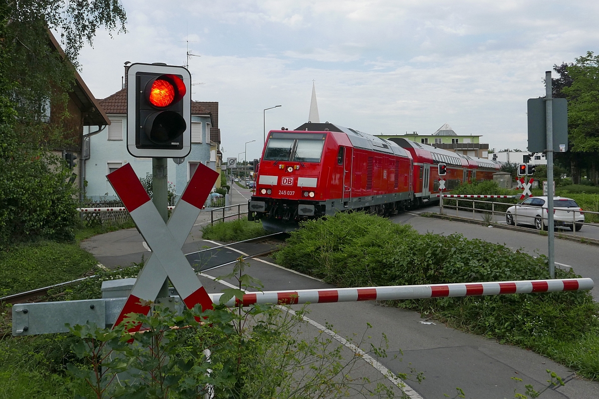 Auf der Fahrt von Lindau nach Stuttgart überquert 245 037 mit dem IRE 4232 in Friedrichshafen die Paulinenstraße und erreicht in Kürze den Stadtbahnhof (31.07.2017) Jürgen Vos