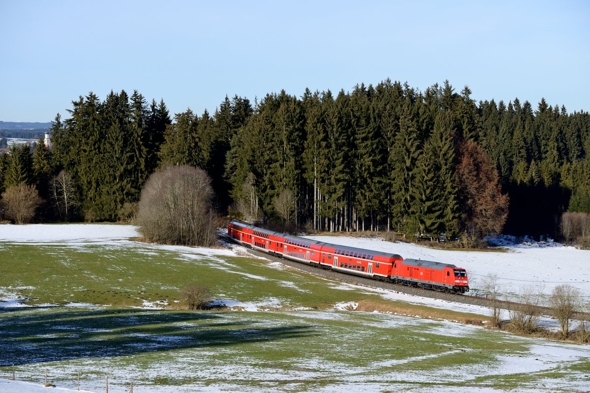Noch etwas gewöhnungsbedürftig sind die Doppelstockwagen mit der Baureihe 245 auf der König-Ludwig-Bahn. RE 57506 nach Füssen konnte am 06. Januar 2015 kurz vor Erreichen des Bahnhofes Weizen-Hopferau aufgenommen werden. Es führt die 245 007. Bedauerlicherweise hatte der Zug "+2", wäre er pünktlich gewesen, wäre der gerade noch hinter dem Waldstück verschwindende Heißluftballon schön im Bild gewesen... Christoph Schneider