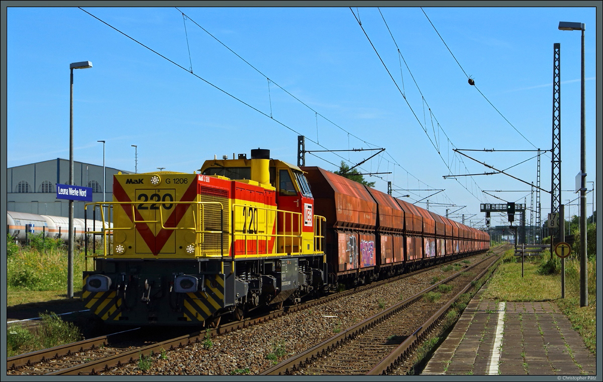 RBB - Regiobahn Bitterfeld Berlin GmbH, Bitterfeld [D] mit der Mak G 1206 Lok "1120" [NVR-Nummer: 92 80 1275 820-9 D-RBB] und einem Ganzzug BLG PKW-Transportwagen (leer) am 13.07.22 Vorbeifahrt Bahnhof Magdeburg-Neustadt. Lothar Stöckmann
