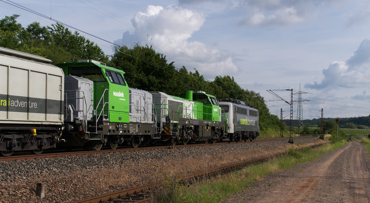Alte Lady mit jungem Gemüse....139 558 (E 40 1558) Baujahr 1965 schleppt die neue Generation von Dieselloks. Railadventure 139 558 hat schon einen ganz schönen Weg hinter sich. Hier ist sie mit einer Vossloh G 18 und Vossloh G 6 auf den letzten 19 Kilometern ihrer Reise von Hamburg-Rothenburgsort nach Saarbrücken Rbf. Wo die Vossloh Loks eingesetzt werden, konnten wir nicht heraus finden, vielleicht gingen sie nach Frankreich. 29.06.2013 - Kraftwerk Ensdorf - KBS 685 - Bahnstrecke 3230 Saarbrücken - Karthaus