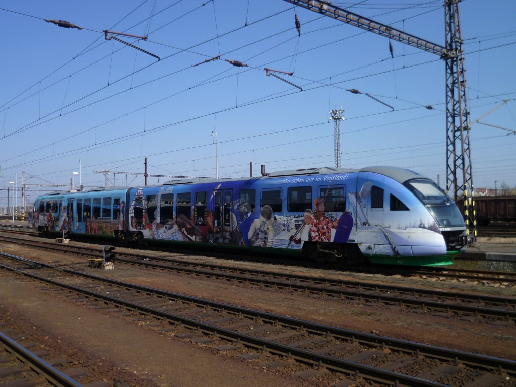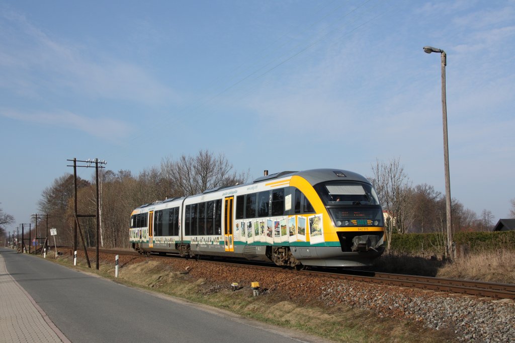 642 915 (mit Werbung für Lausitzer Lieblingsplätze) fährt als OE 79533 von Cottbus nach Zittau in den Bahnhof von Horka ein. Fotografiert am 16.03.2012. Christian Geschonneck