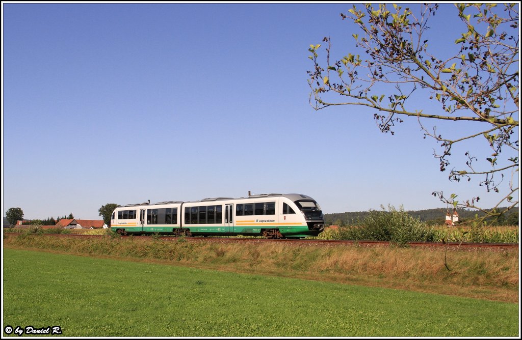 Vt 11 mit VBG 81131 von Hof Hbf nach Regensburg Hbf ausnahmsweise mit 2 Triebwagen wegen des aktuellen Notfallfahrplans der Vogtlandbahn bei der Fahrt zwischen Pechbrunn und Wiesau (Oberpf), 27.06.2011 Korbinian Eckert