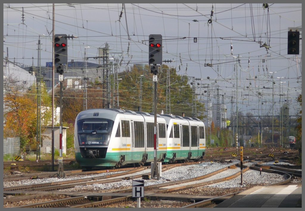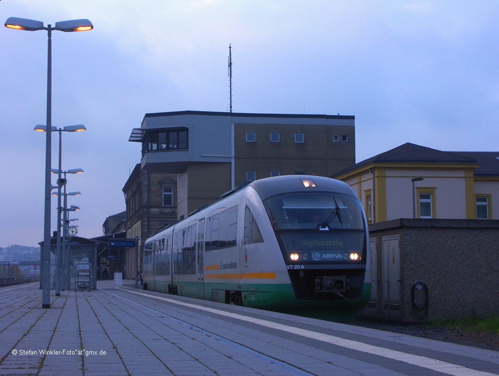 Am Sonntag 17.10.2010 konnte der VGB VT20 auf dem Selber Stutzengleis in Hof Hbf gesehen werden. War offensichtlich nur in Warteposition dort. Kurze Zeit später rangierte er von dort auf Gleis 4 hinüber. Wegen der Dunkelheit ging das Licht am Bahnsteig an, dann aber wieder aus - die Sonne blitzte nochmal kurz über den Bahnhof..... Ober franke