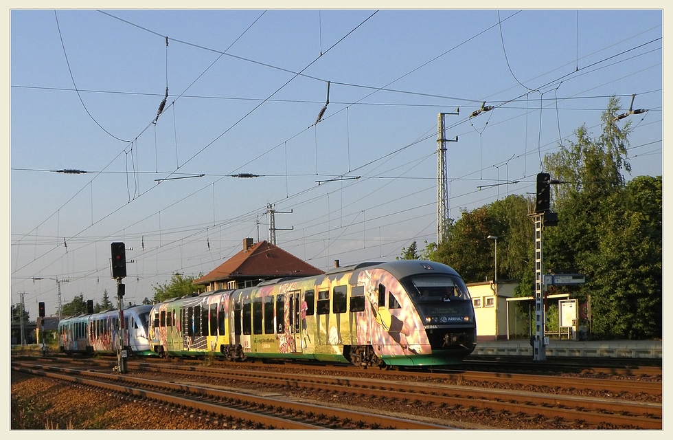 Zugkreuzung im Bf Berga/E. am 27.11.2010 mit VT09 (83163 nach Weischlitz) und VT07 (83166 nach Gera). VT07 wird demnächst sein angestammtes Einsatzgebiet Richtung Liberec verlassen, die Anschriften für den trilex wurden bereits angebracht. Rüdiger Ulrich