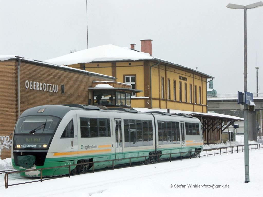 VGB Desiro von Schwandorf nach Hof bei der Ausfahrt aus Bf. Oberkotzau vor dem EG und dem Stw. 4.02.2010 .Das grosse Empfangsgebäude ist komplett leer, keine Schalterhalle offen, alles verbrettert und dem Untergang geweiht. Schlimm. Bei dem Anblick kam mir der Gedanke dass die DB AG wie die alte DDR ist, bzw. wohl deren Weg gehen wird. Alles wird niedergewirtschaftet und überall rausgezogen wegen des geplanten Börsenganges. Dann, später, wird man sich wohl übernehmen lassen und jemand anderes darf den Wiederaufbau teuer und bitter bezahlen...... Der geneigte Leser möge mal darüber nachdenken... Ober franke