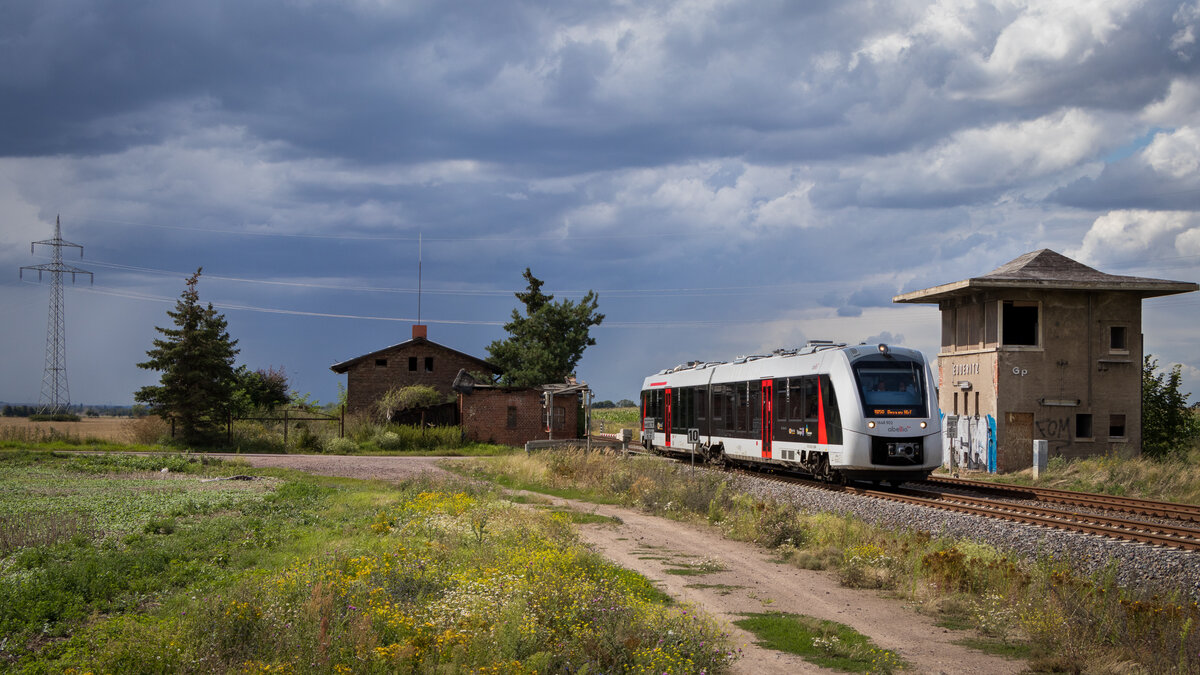 Blick Richtung Brocken, vorbei am Stellwerk Wernigerode und über einen einfahrenden RE 21 (75755), gefahren durch 1648 903 von Abellio, hinweg.
