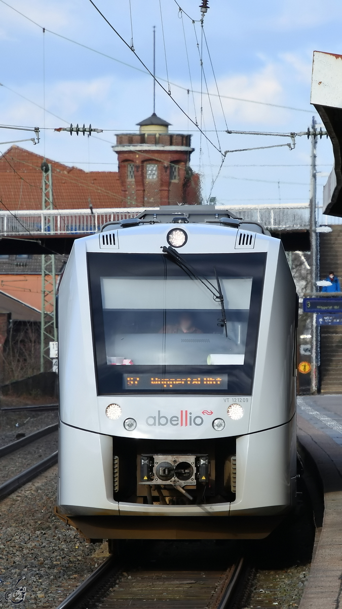 VIAS-LINT 121203 (1648 003, ex Abellio) hat die Müngstener Brücke verlassen und fährt in Solingen-Schaberg ein. Aufnahme S 7 Wuppertal - Solingen, 2.3.22. Hermann-Josef Weirich