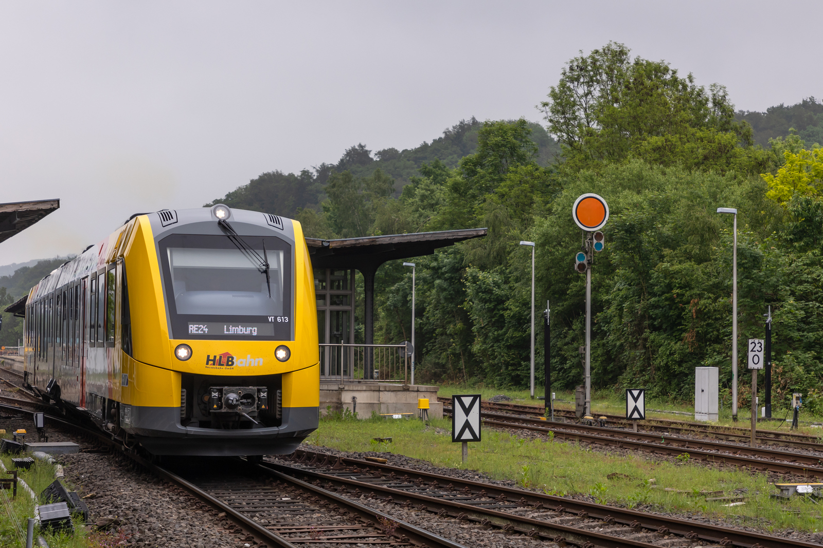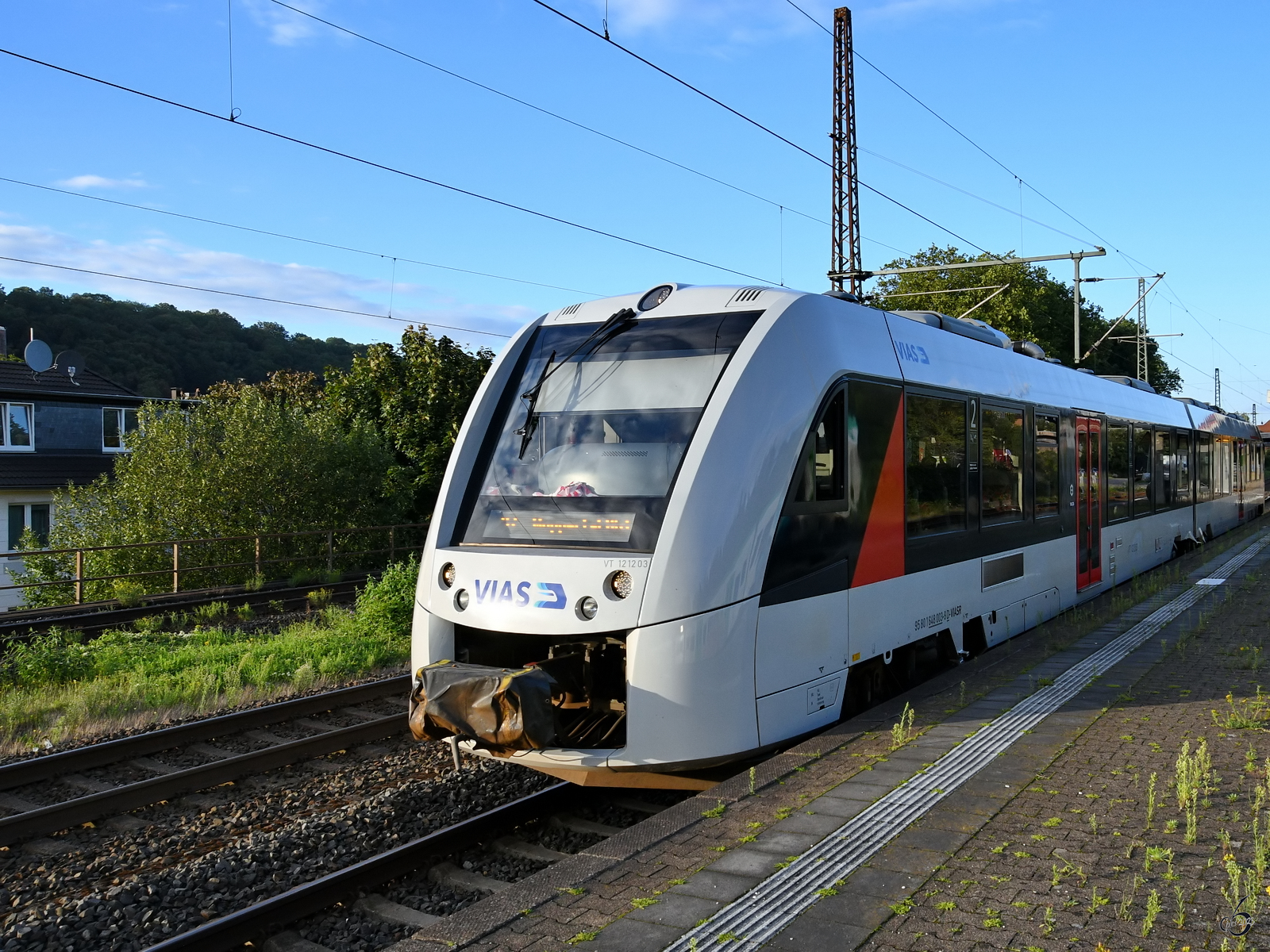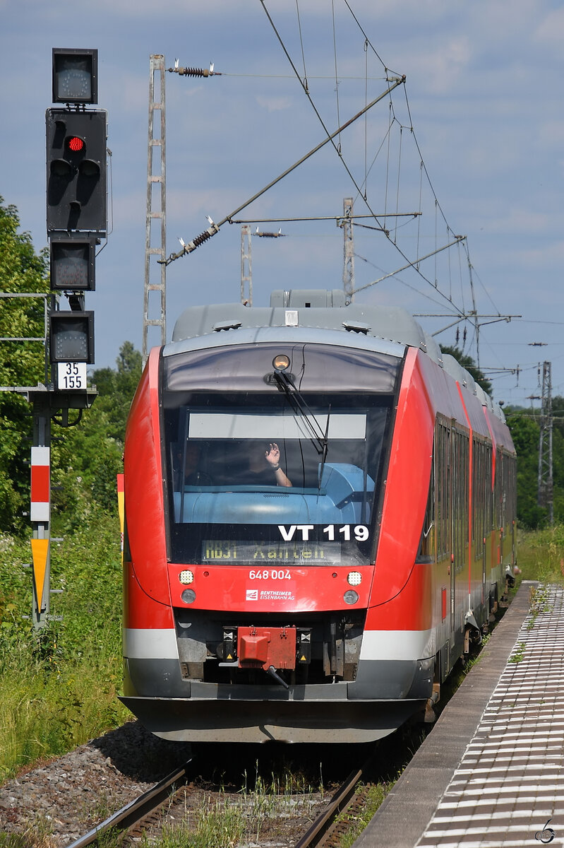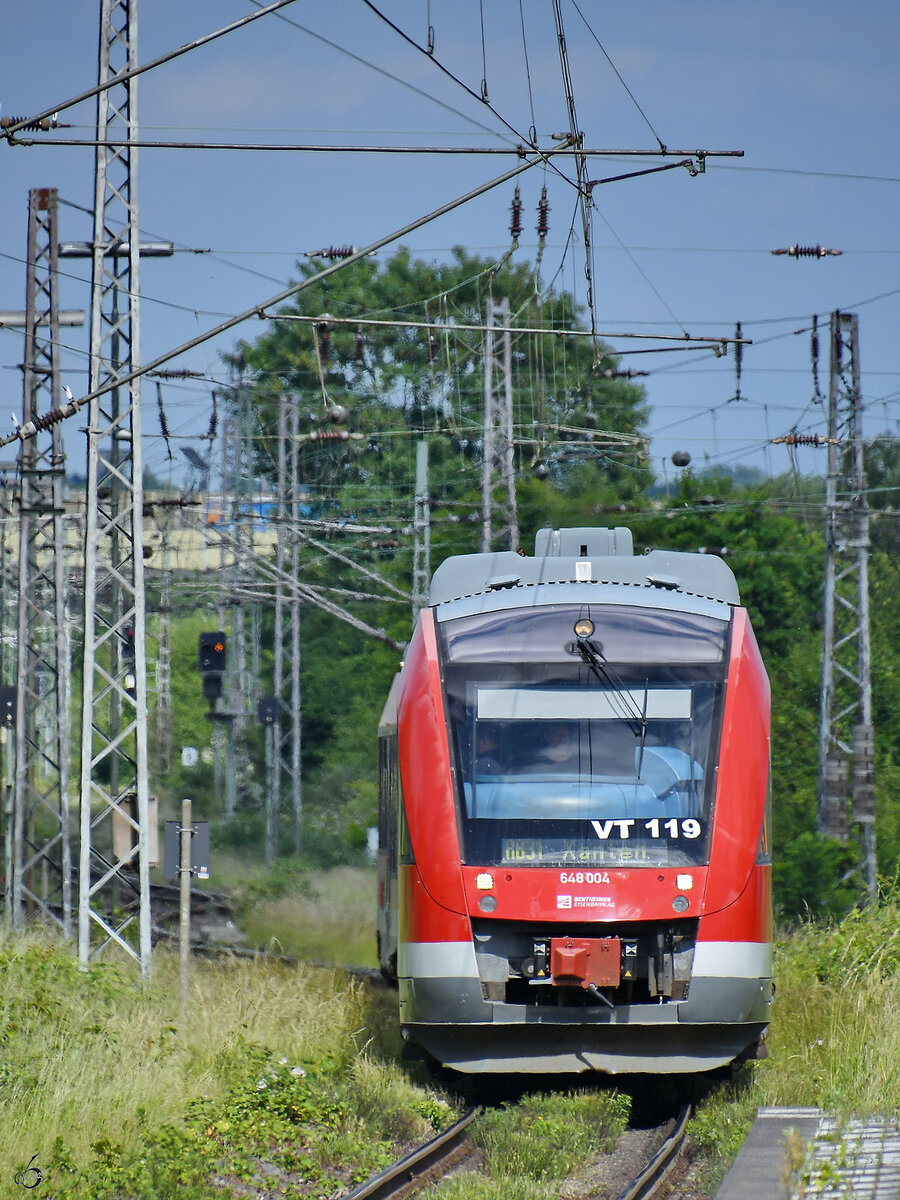 Ende Mai 2025 wurde auf der Linie RB31 der Dieseltriebzug VT119 (648 004) eingesetzt, hier abgelichtet kurz vor dem Bahnsteig in Duisburg-Hochfeld Süd.